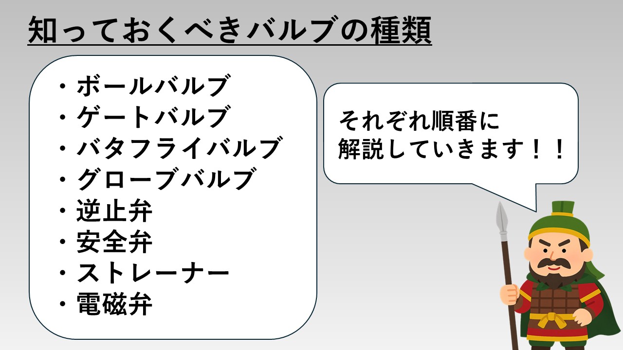 そこで、ここからは皆さんが最低限知っておくべきバルブの種類とその役割を解説していきますので、しっかり覚えていきましょう!