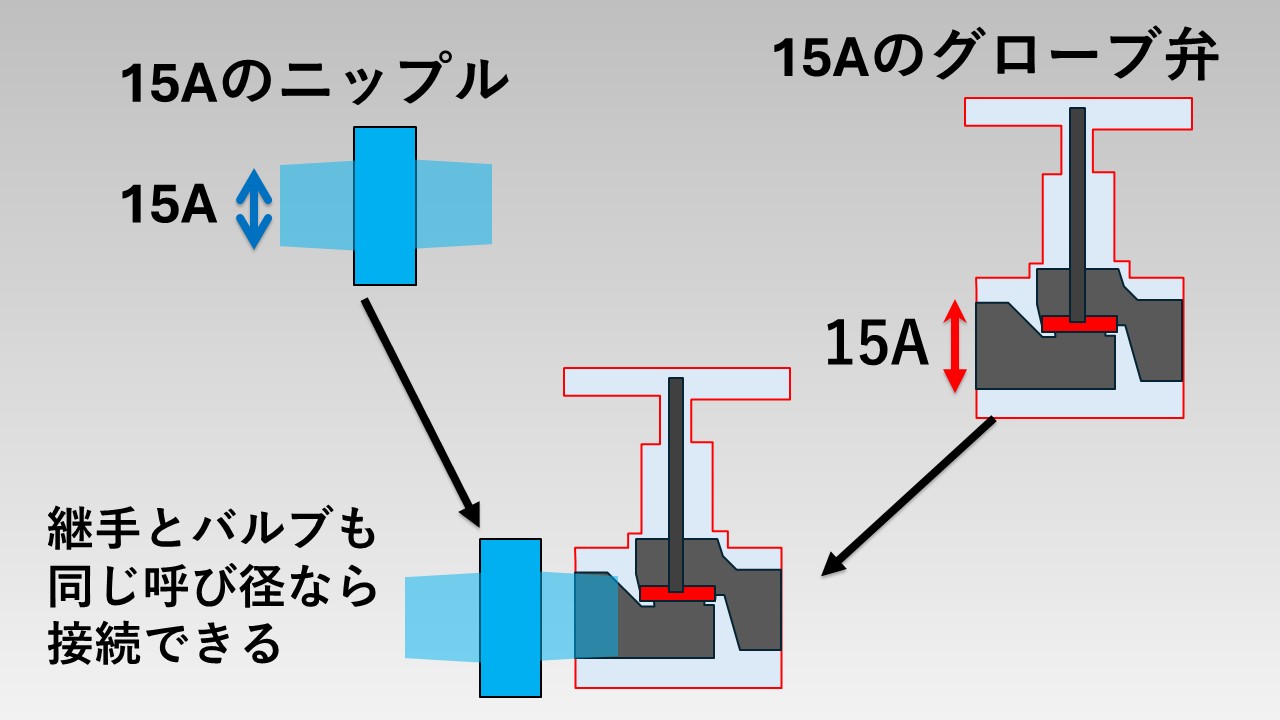 同様に、15Aニップルに、グローブ弁をつけたいときは、15Aのグローブ弁を選ぶ必要があります。