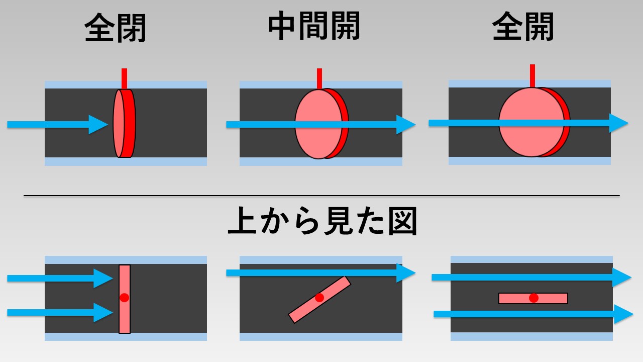 - 図のように、バルブ内に円形の板があり、90°回転する構造
