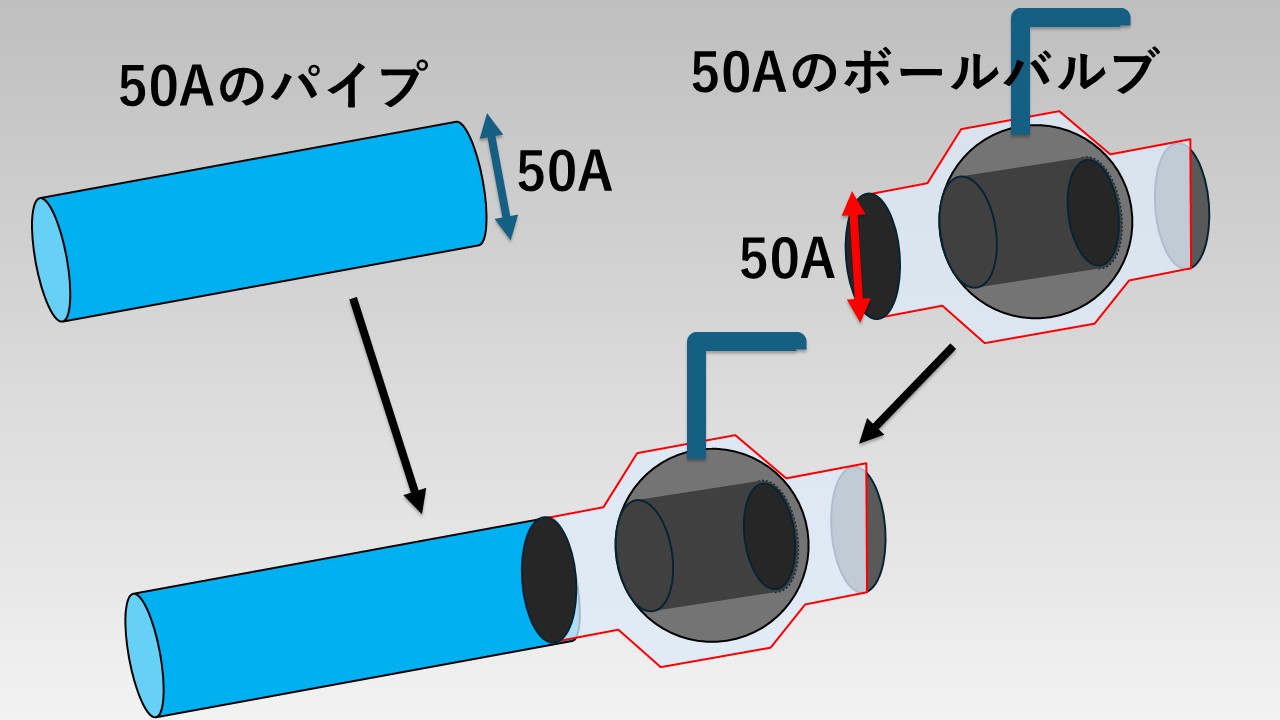例えば、50Aのパイプにボールバルブを接続したい場合は、パイプの呼び径と同じ50Aのボールバルブを選ぶ必要があります。