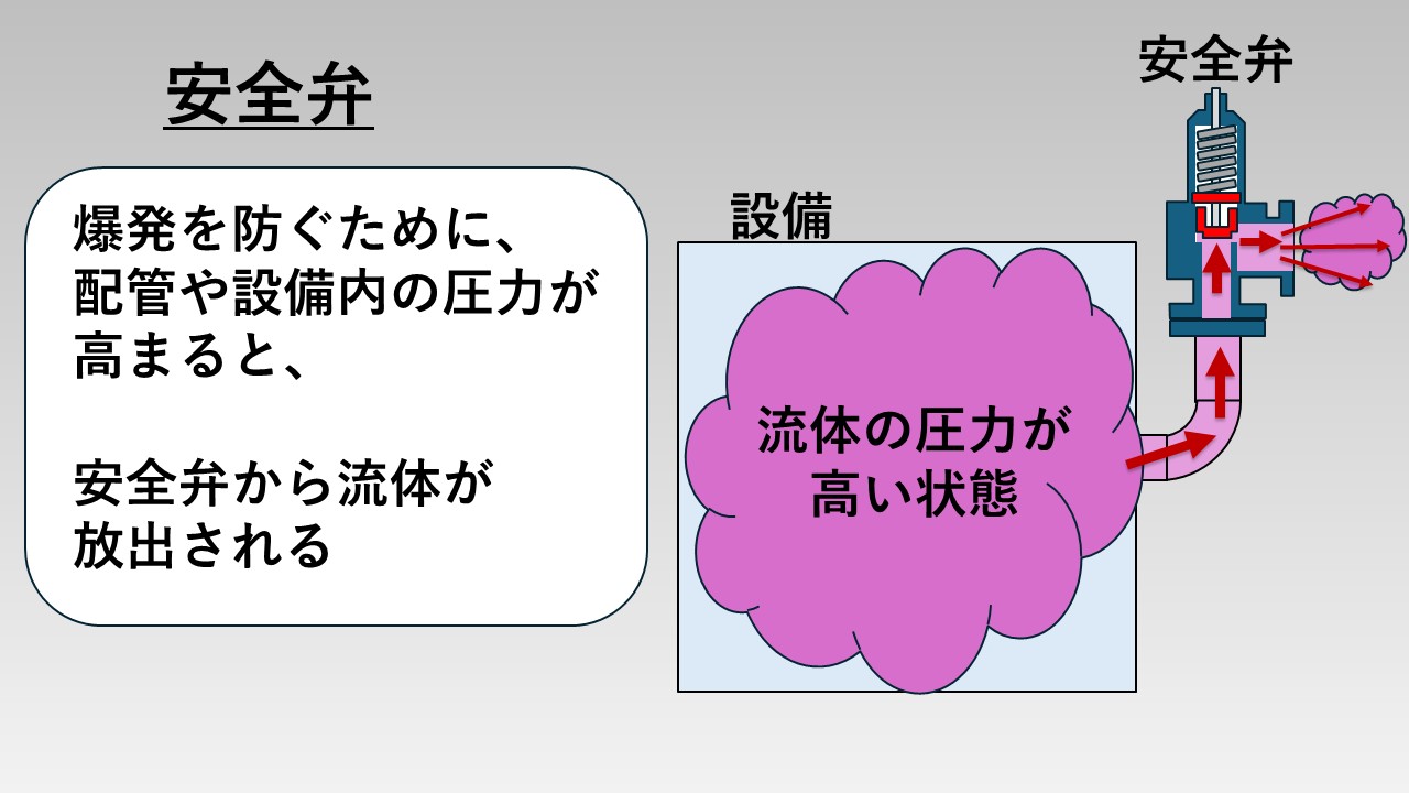 - 設備や配管に安全弁を接続しておくことで、何かしらの事故で、設備や配管内の圧力が高くなった際に、自動的に流体を外に出して圧力を下げ、設備や配管が爆発するのを防ぐ役割がある。