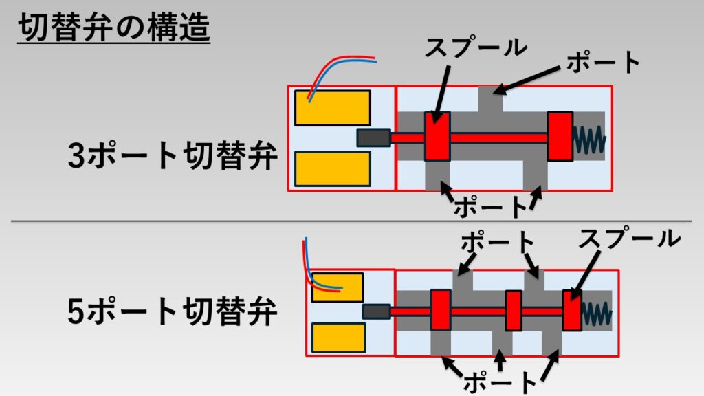 - 5ポート切替弁は2方向に力強い動きができるシリンダー(複動シリンダー)につながる油や圧縮空気の配管に使用される