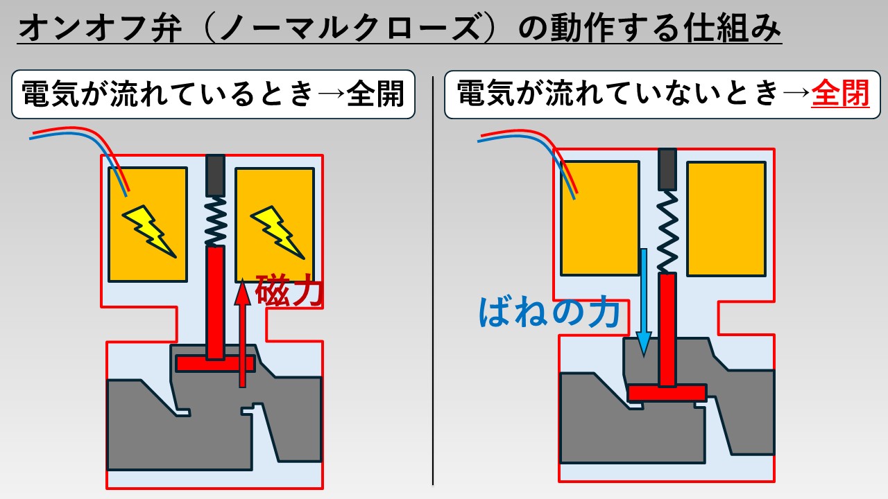 オンオフ弁の構造が分かったところで、ここからはオンオフ弁が動作する仕組みを解説します。