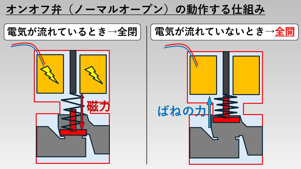 オンオフ弁(ノーマルオープン)が動作する仕組み