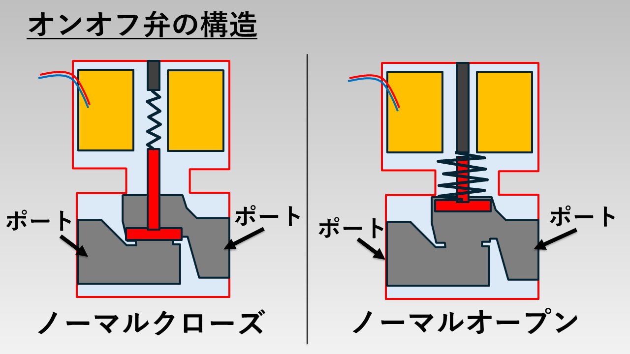 オンオフ弁のノーマルクローズタイプとノーマルオープンタイプが動作する仕組みをそれぞれ見ていきます。