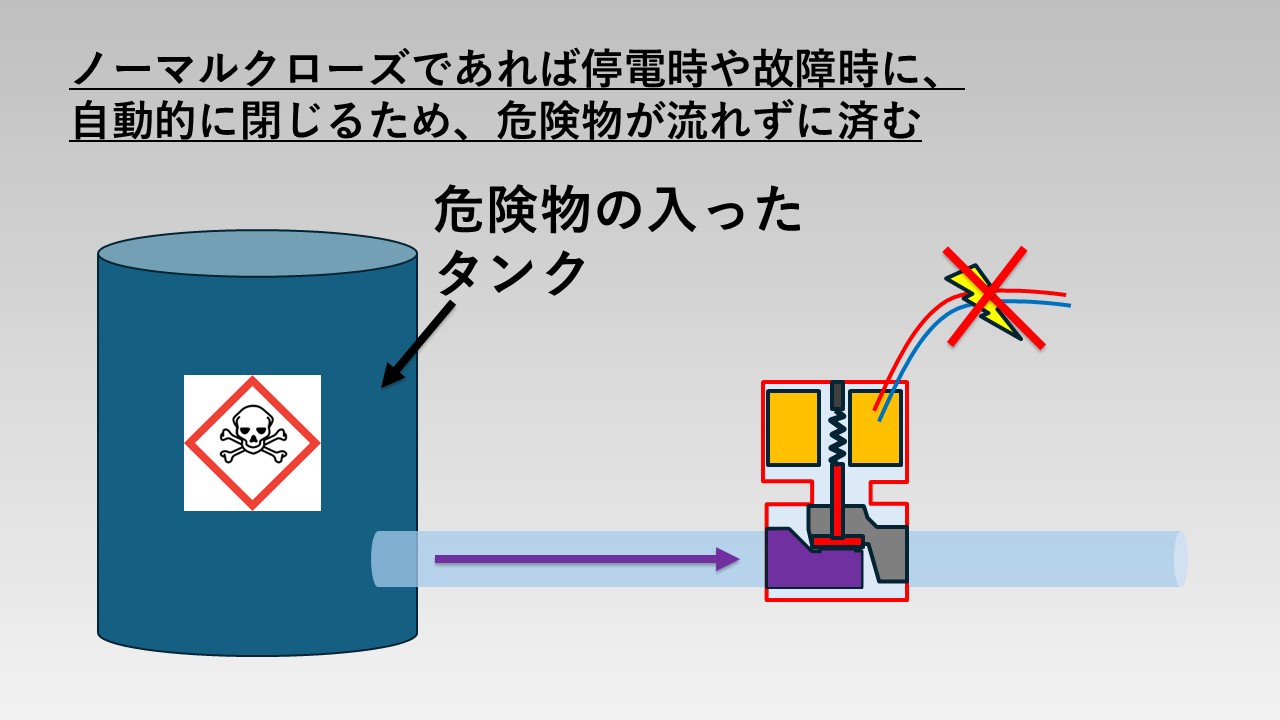 - 停電時や電磁弁の故障時に、危険なガスや液体が流れっぱなしになるのを防ぐため