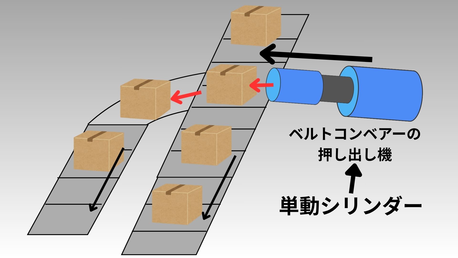 - 単動シリンダーの例:ベルトコンベアーを流れる製品を押し出す機械のシリンダー