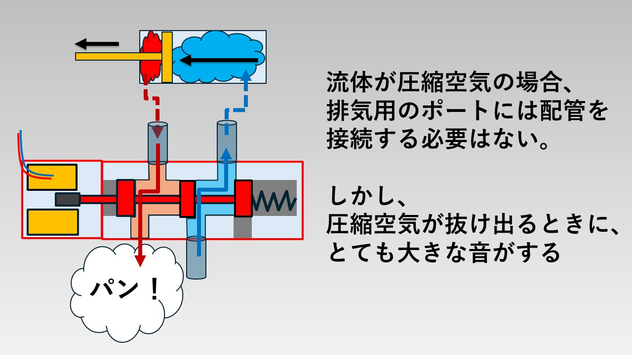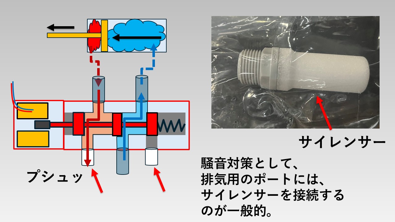 しかし、電磁弁から抜け出るときに非常に大きな音が鳴るため、排出口のポートにサイレンサーを付けるのが一般的です。サイレンサーを付けることが音が小さくなります。