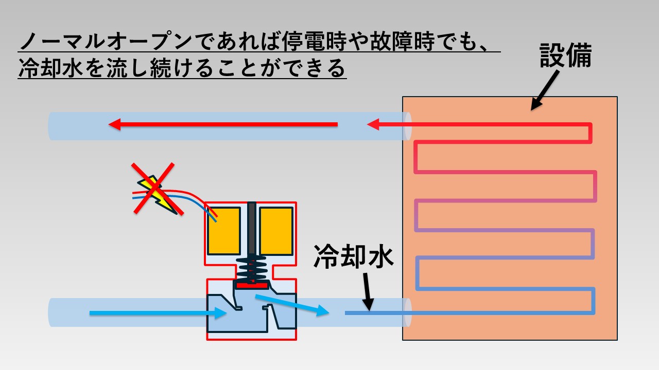 - 停電時や電磁弁の故障時にも、設備を冷やすために流し続けておく必要があるから