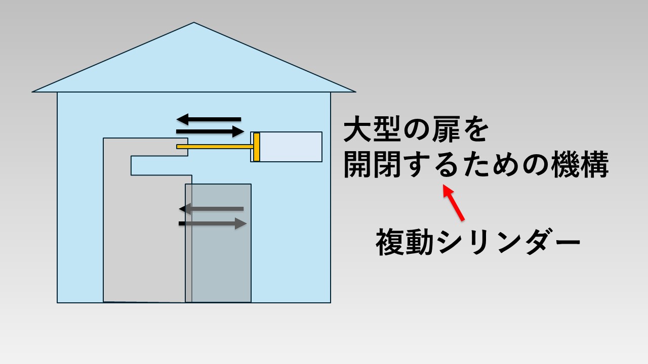 - 複動シリンダーの例:大型扉の開閉機構