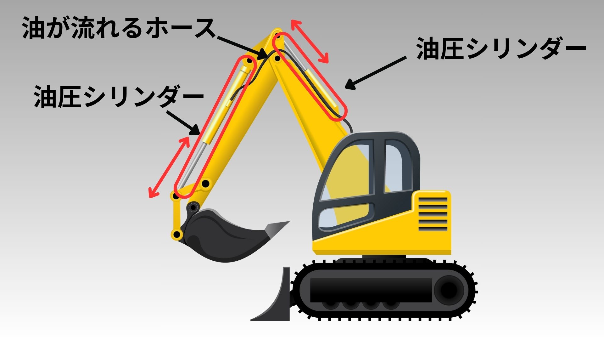 ショベルカーは力強く大量の土砂を掘ることができていますが、あのパワーは、搭載されている油圧シリンダーとそこに流れ込んでいる流体(油)が生み出すパワーからきています。