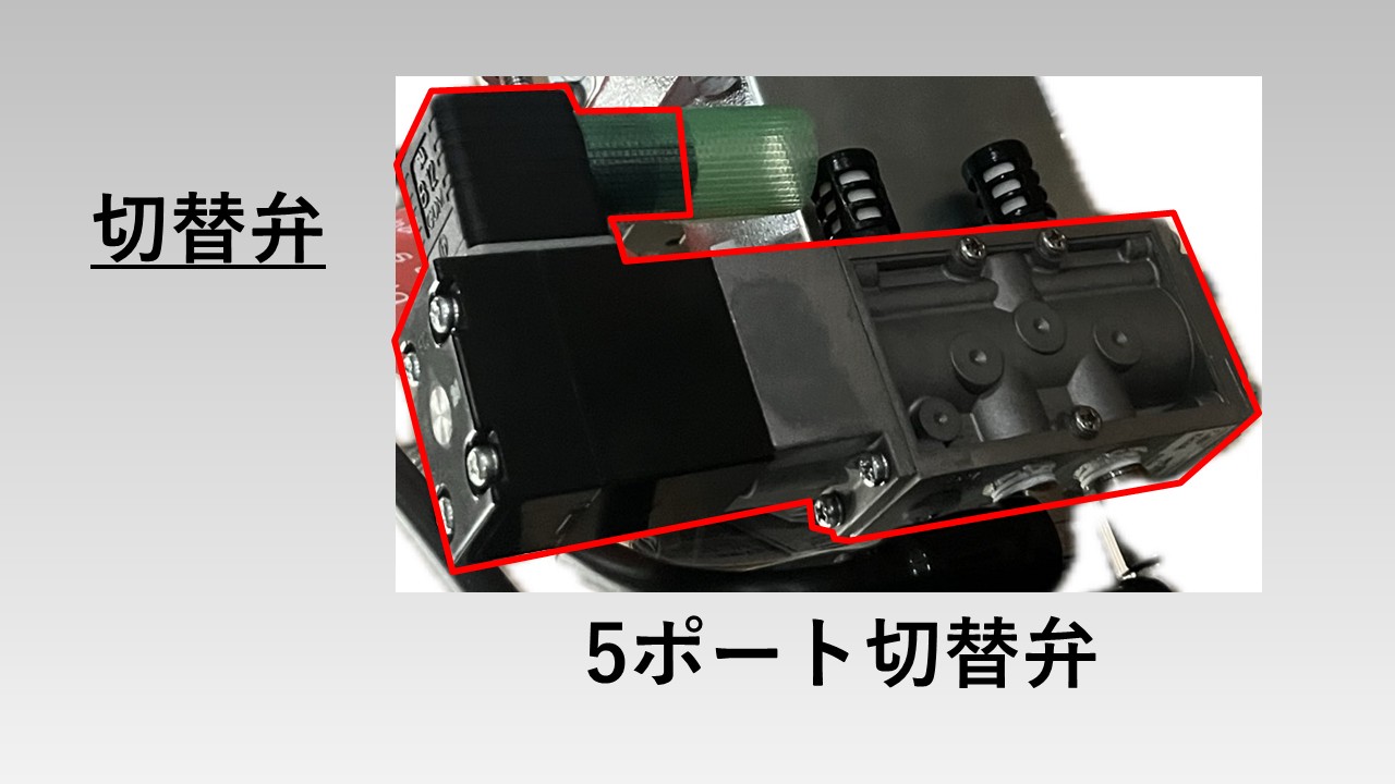 - 5ポート切替弁:複動シリンダーに流れ込む流体の配管のバルブ