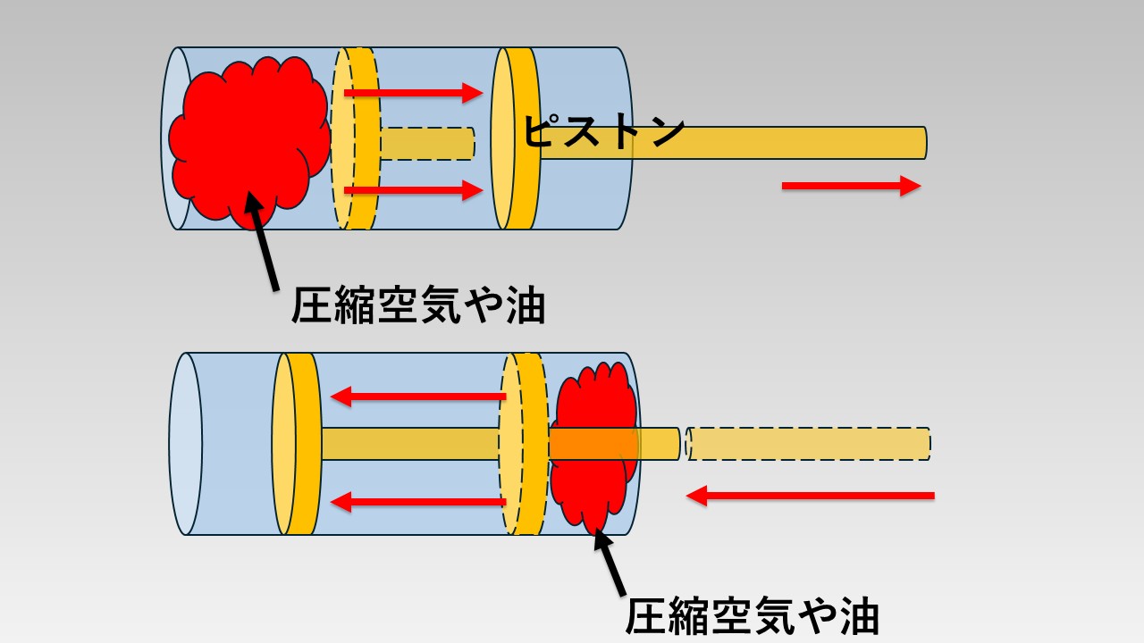 - 筒の中に圧縮空気や油が流れ込むことで、ピストンが動く仕組み