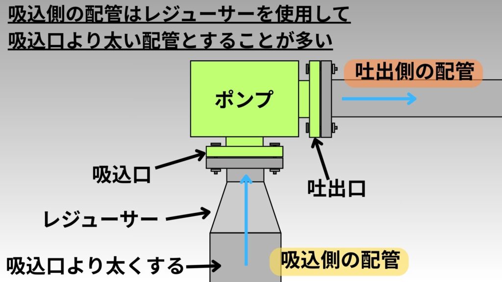 図のように、吸込側の配管は吸込口の直前にレジューサーを入れて、吸込口の口径よりも太い配管とすることが多いです。