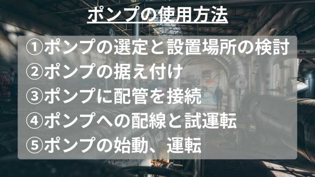 ポンプを使用するには、まずポンプの選定と設置場所を検討する必要があります。
