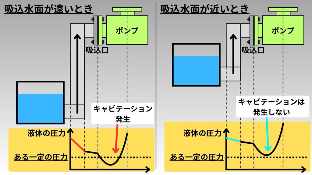 - ポンプの設置場所を吸込水面の近くにすることで、ポンプの吸込能力(=大気圧)に余裕がある状態で液体がポンプにたどり着くため、液体の圧力が高い状態になる。