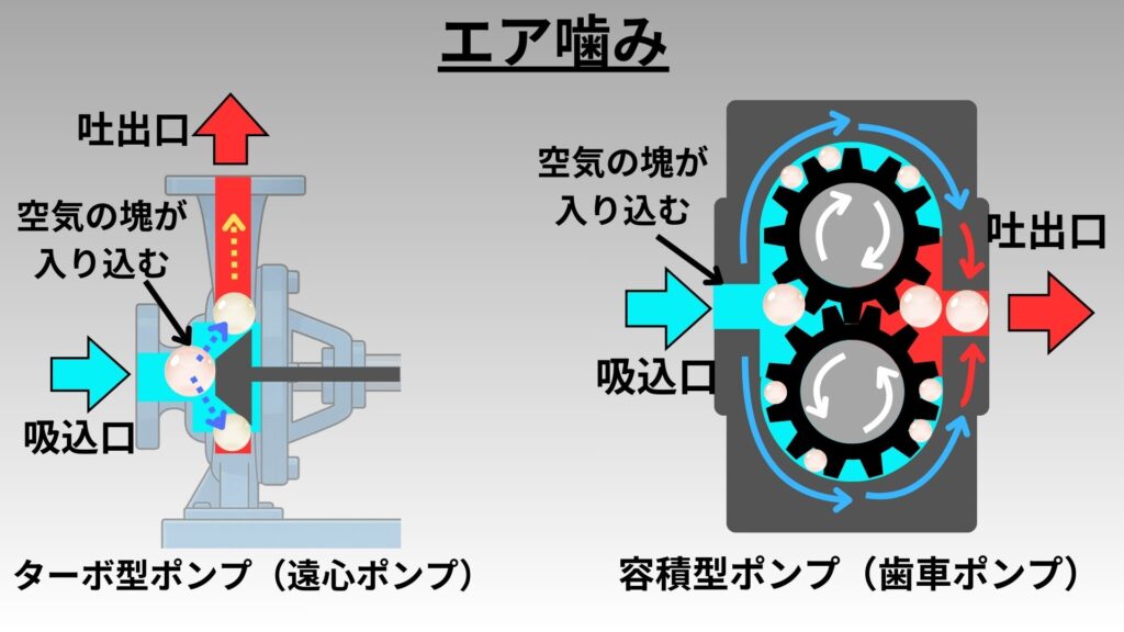 エア咬みが発生する原因は、何かしらの理由で吸込側の配管にエア(空気)が入り込み、ポンプにエアの塊が一気に流れ込むことで発生する。