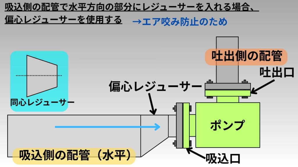 - 「吸込側の配管で水平方向の部分にレジューサーを入れる場合、偏心レジューサーを使用する」