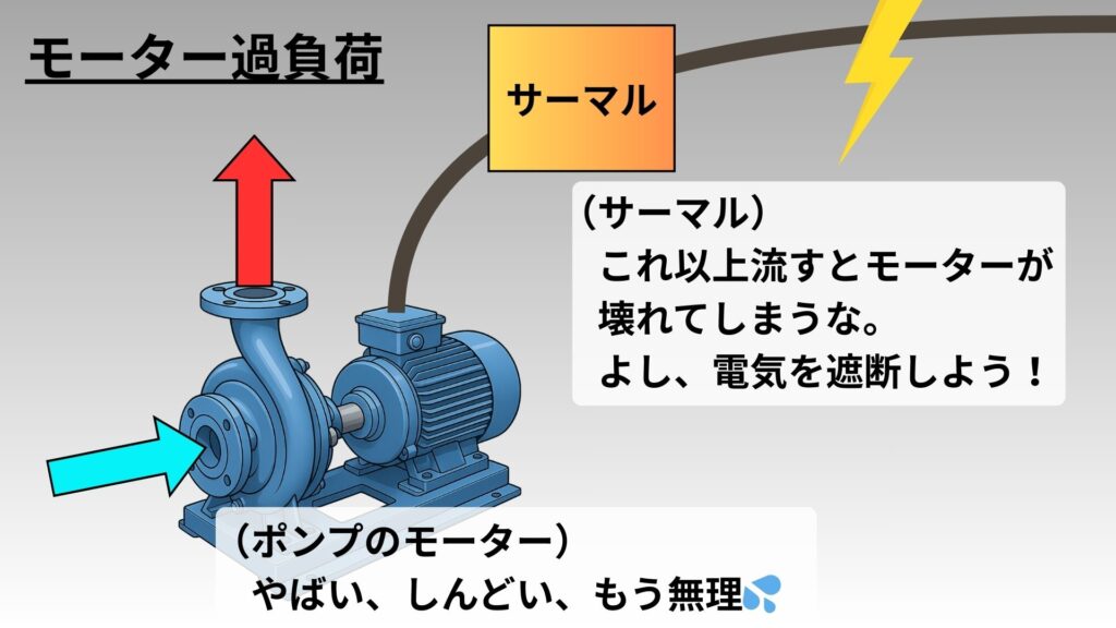 モーター過負荷となると、モーターを守るために配線経路上に設置された保護装置(サーマルリレー)が作動して電気を遮断し、モーターを停止させる。(=ポンプ停止)