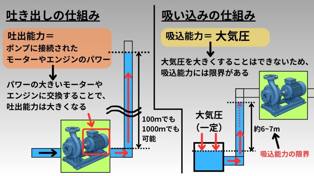 つまり、「吐き出し能力=ポンプに接続するモーターやエンジンのパワー」であるため、パワーの大きいモーターやエンジンを使えば、いくらでも吐き出し能力は大きくなります。