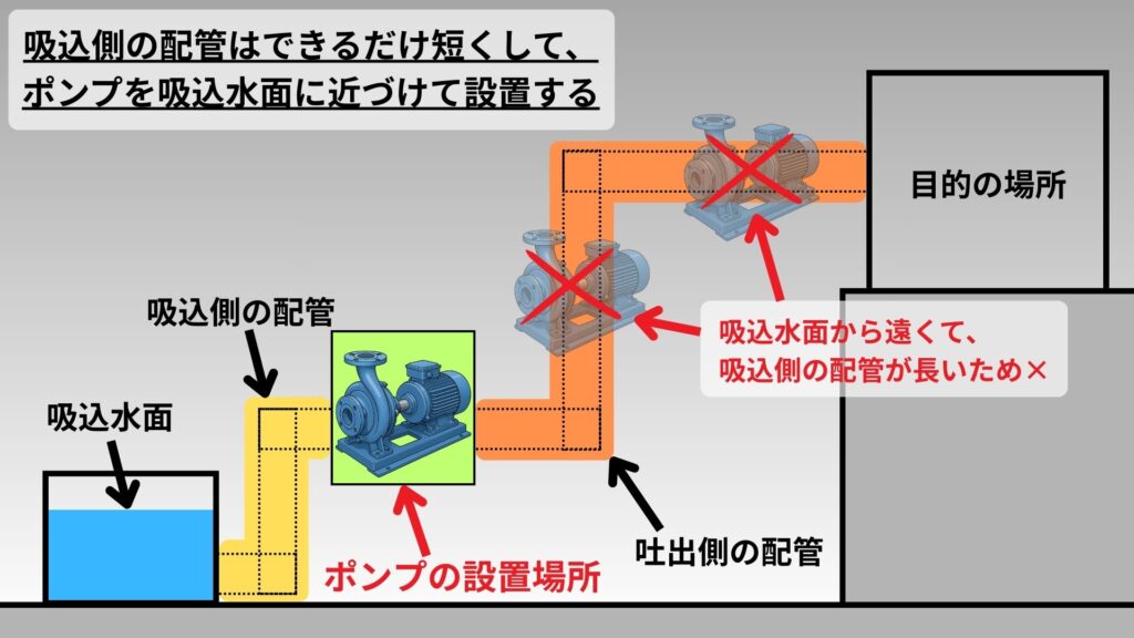 「吸込側の配管はできるだけ短くして、ポンプを吸込水面に近づけて設置する」