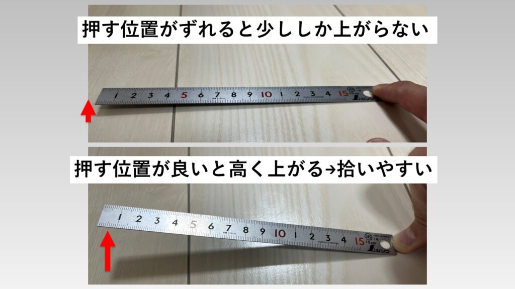 そのため、「PICK UP」部分を上から押すと、シーソーのように反対側が持ち上がり、難なく拾うことができます。