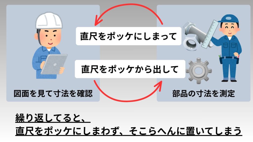 そんななか、直尺を使うためにポッケからだし、部品の寸法を測定する。そのあと、直尺をポッケに戻す。そして、また直尺を使うためにポッケからだし、またポッケにしまう、、、
