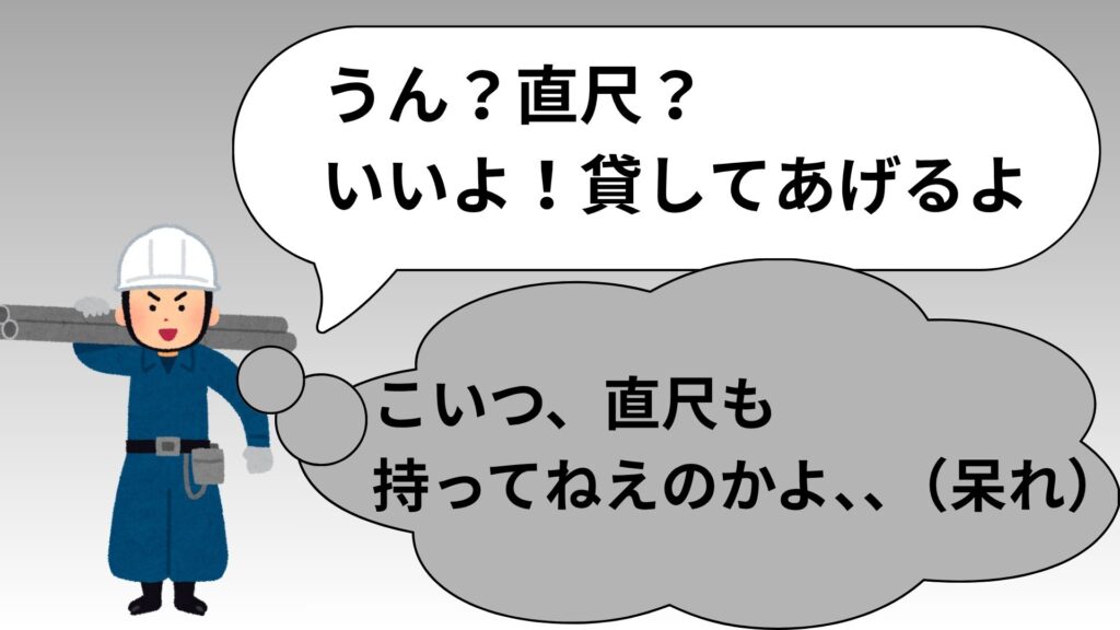 その時は確かに、直尺は貸してくれると思いますが、同時にあなたへの信頼度も減っているということを自覚しましょう。なぜなら、貸した人は「こいつは、直尺も持ってないんか、、(呆れ)」となるから。(特に、あなたが工業の世界に入ったばかりの新人なら、なおさら、そう思われてしまいます。)