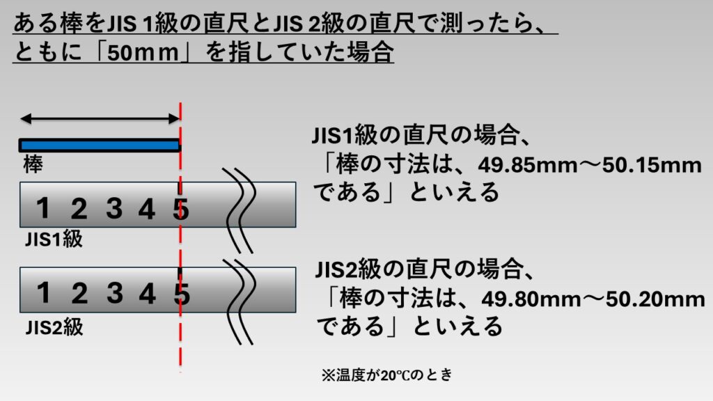 例えば、ある棒を「JIS 1級」の直尺と「JIS 2級」の直尺で測ったとき、それぞれの測定した値がともに「50mm」であっても、以下のように言えます。