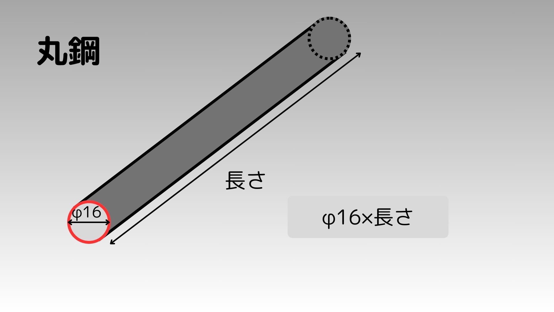 - 規格では「φ16×長さ」や「D16×長さ」で表記され、「φ」や「D」は直径という意味。(←どの数字がどの寸法を表しているかは覚える必要無し。その都度、ネットで調べればOK)