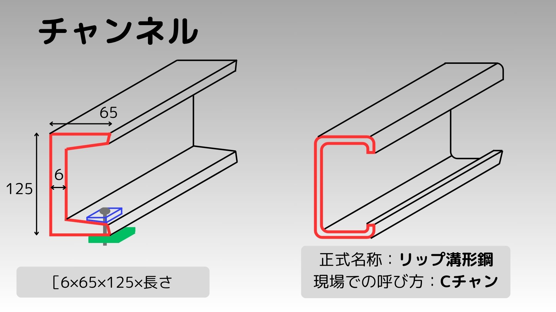 - チャンネルの中には断面が「C」形の「リップ溝形鋼(現場での呼称:Cチャン)」が存在する。