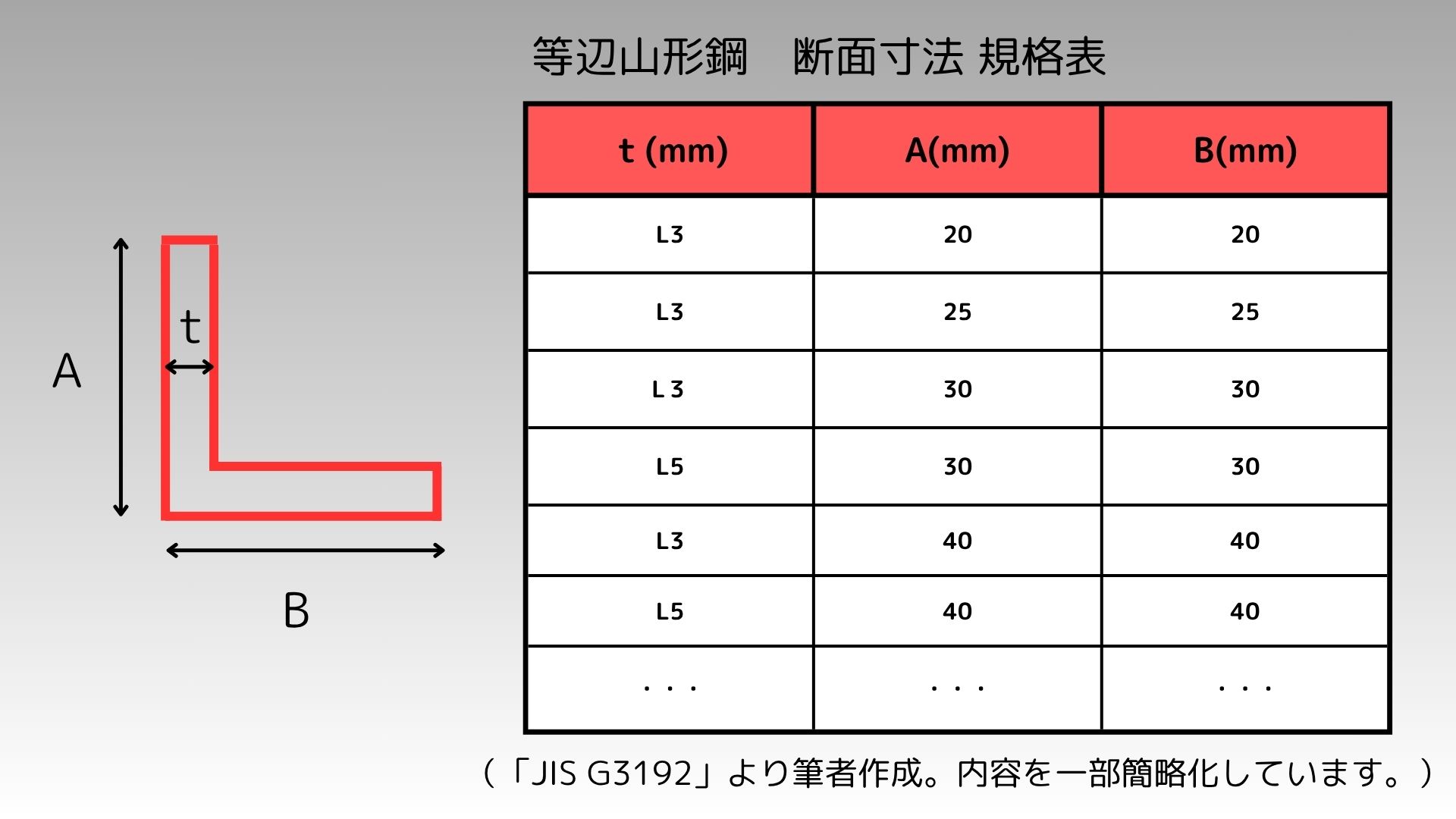 - 規格では「L 6×50×50×長さ」で等辺山形鋼を、「不L7×75×100×長さ」で不等辺山形鋼を表し、それぞれ板厚と辺の長さを示します。(←どの数字がどの寸法を表しているかは覚える必要無し。その都度、ネットで調べればOK)