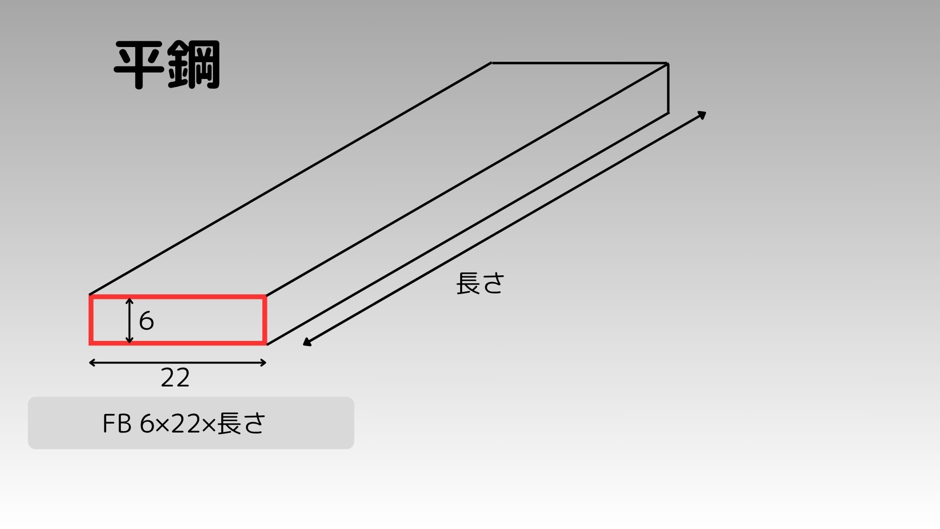 - 規格では「FB 6㎜×22㎜×長さ」と表記され、厚み6㎜、幅22㎜の断面を持つ平鋼を表す。(←どの数字がどの寸法を表しているかは覚える必要無し。その都度、ネットで調べればOK)